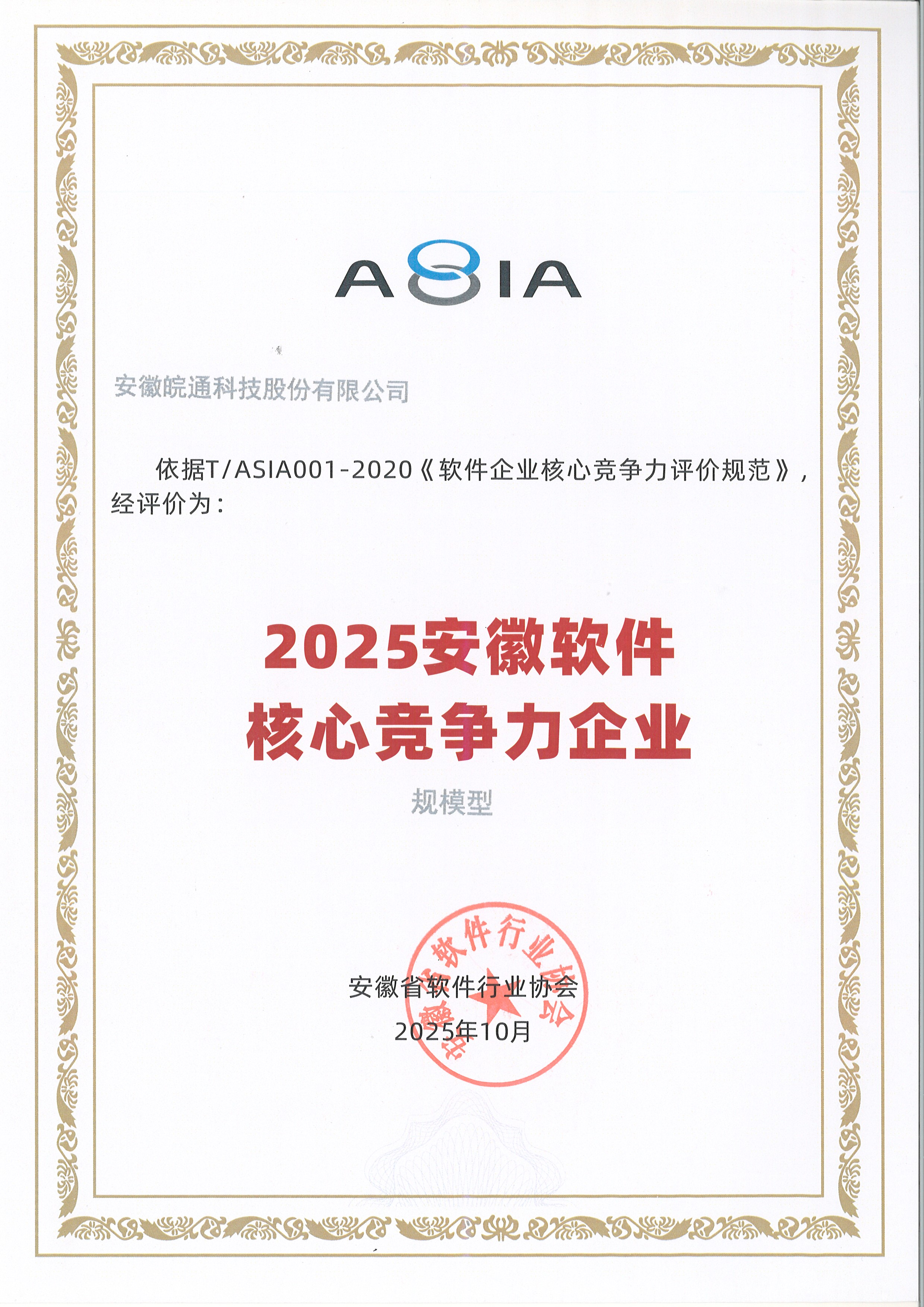 近日,“2025年安徽軟件核心競爭力企業(yè)”評(píng)價(jià)結(jié)果正式公布,皖通科技憑借扎實(shí)的技術(shù)研發(fā)實(shí)力、豐富的行業(yè)實(shí)踐經(jīng)驗(yàn)及卓越的市場競爭力,連續(xù)四年榮登榜單,成功獲評(píng)“2025年安徽軟件核心競爭力企業(yè)(規(guī)模型)”。這一榮譽(yù),充分彰顯了行業(yè)主管部門及專業(yè)機(jī)構(gòu)對(duì)公司在軟件領(lǐng)域綜合實(shí)力的權(quán)威認(rèn)可。